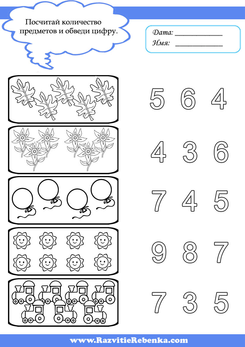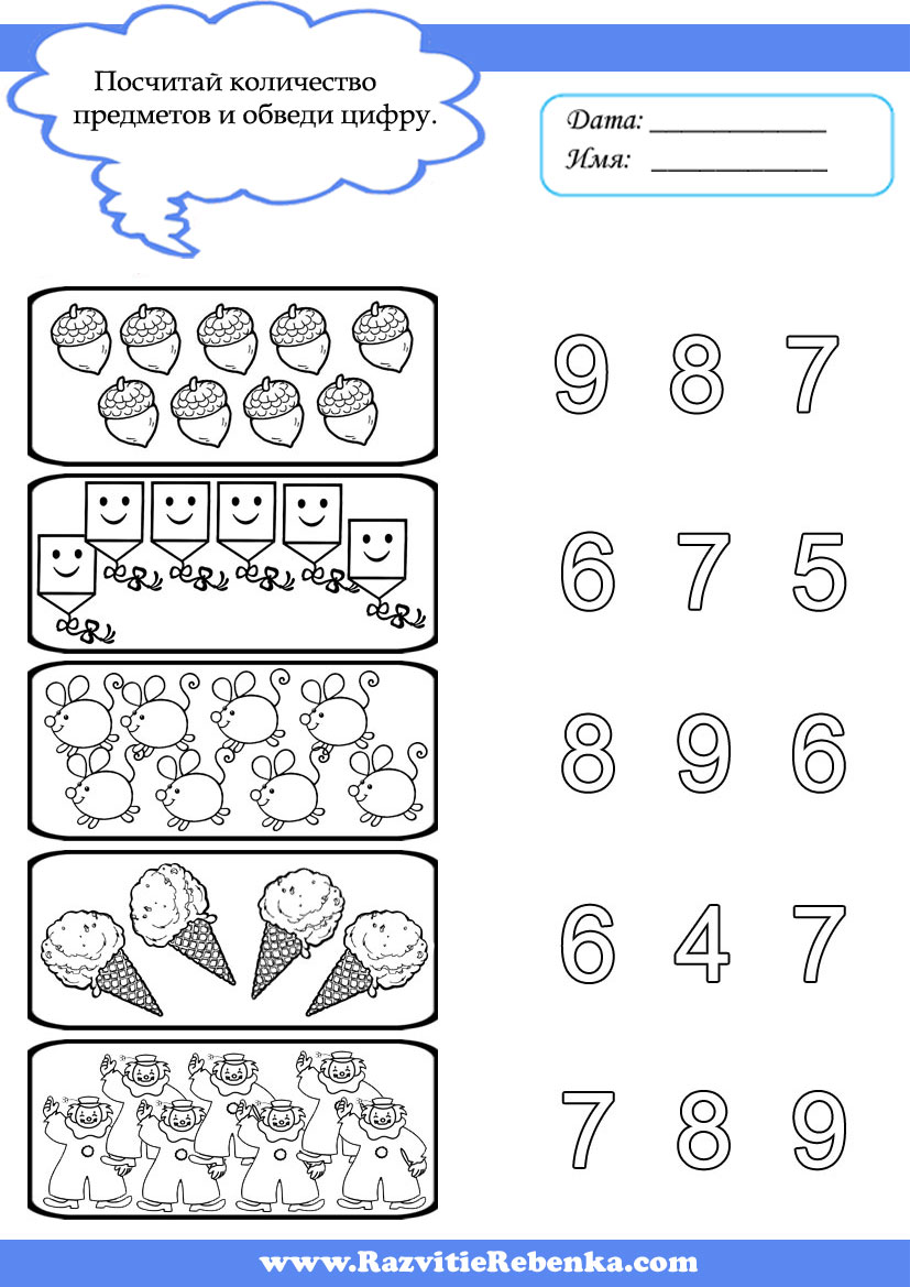 Ребенок должен посчитать предметы и обвести кружочком нужную цифру.